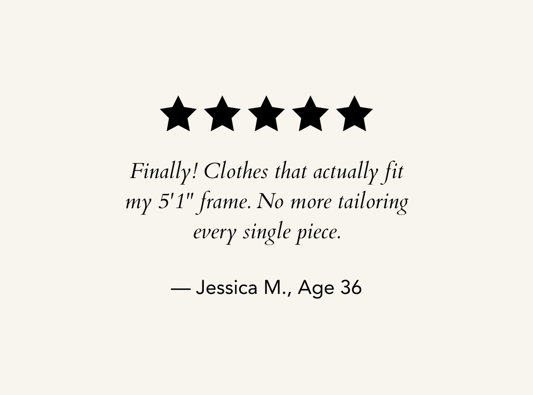Take our 5-minute style quiz. We'll curate 5-9 pieces made for petite frames and deliver them to your door.
